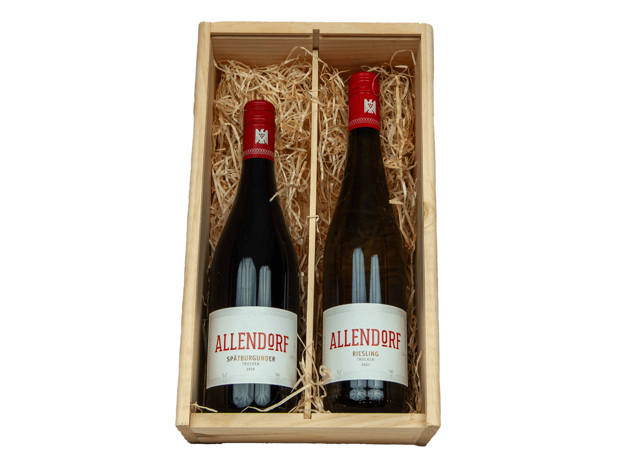 Dit wijngeschenk van Allendorf bestaat uit twee mooie wijnen, de Spätburgunder trocken & Riesling trocken.