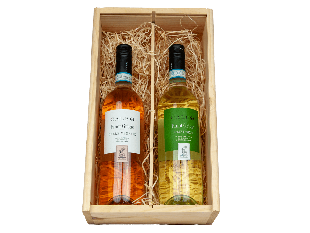 Dit wijngeschenk van Caleo bestaat uit twee mooie wijnen, namelijk de Caleo Pinot Grigio Blush Rosé & de Caleo Pinot Grigio.