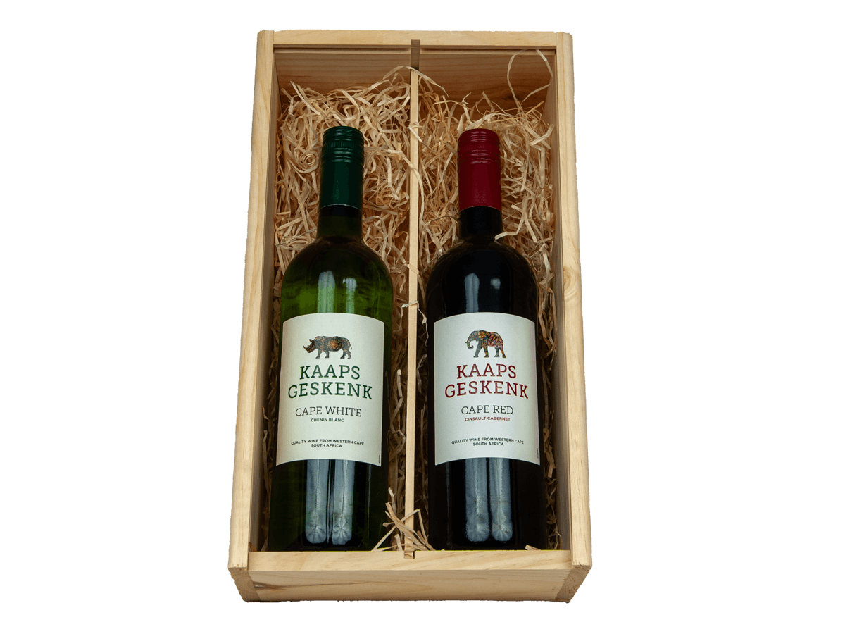 Dit wijngeschenk van Kaaps Geskenk bestaat uit twee mooie wijnen, namelijk de Kaaps Geskenk Cape Red & de Kaaps Geskenk Cape White.