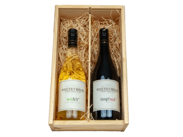 Dit wijngeschenk van Weltevrede Sp!rit bestaat uit twee mooie wijnen, namelijk de Weltevrede Sp!irit Inps!red Merlot & de Weltevrede Sp!rit With !t Sauvignon Blanc.